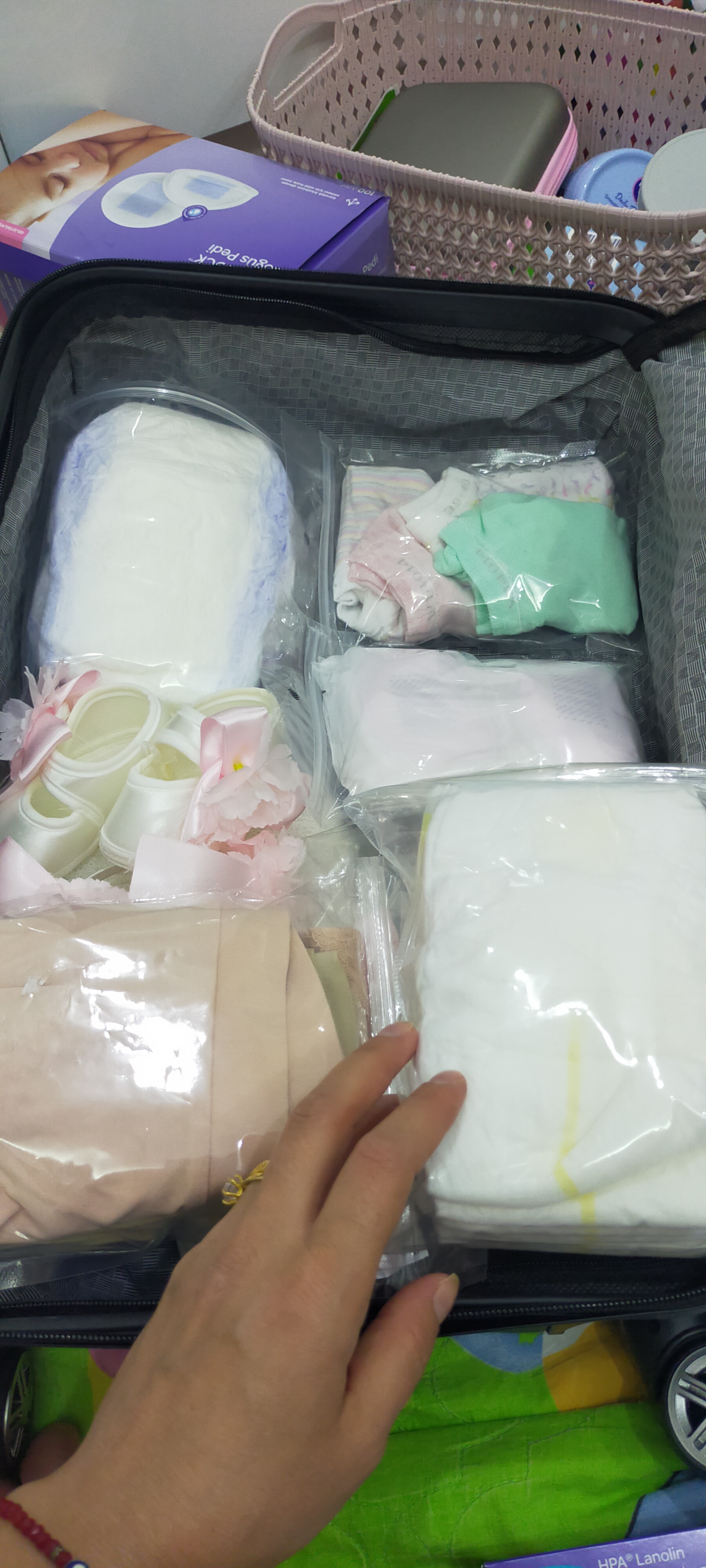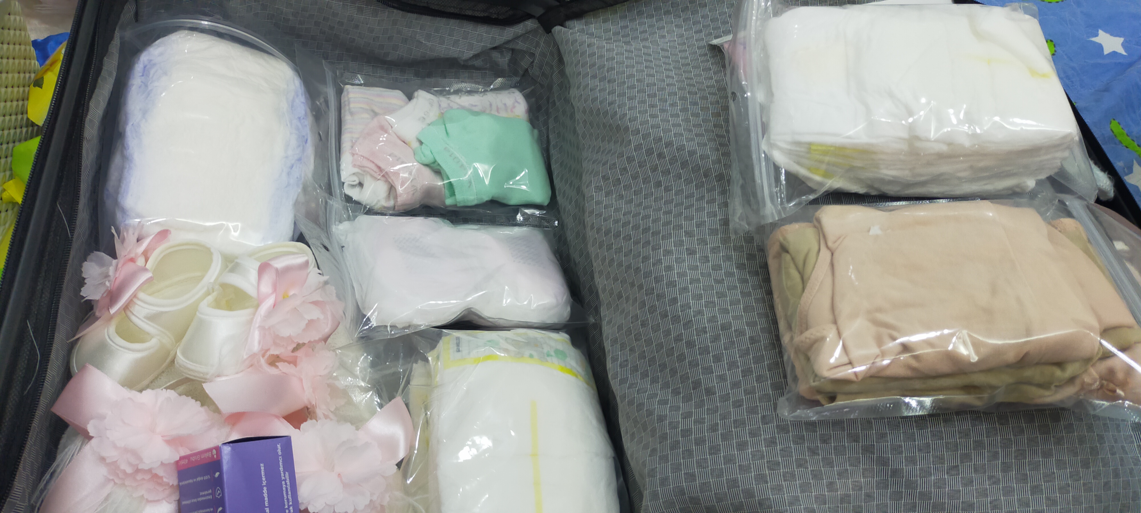 Kızlar sonumda çantamı hazırladım Allahım herkesin gönlüne göre versin sağlıkla bebeklerimizle kurtulmayı nasip etsin inşallah 33+5 haftaligiz küçük çıtçıtlı poşetler aldım göğüs pedi minnak çoraplarını ağız mendilleri mi eldivenleri Orkid bunları ayrı ayrı paketledim valizde bulması kolay olsun diye çokta güzel oldu belki bir fikir olur diye yazdım öpüldünüz anisler