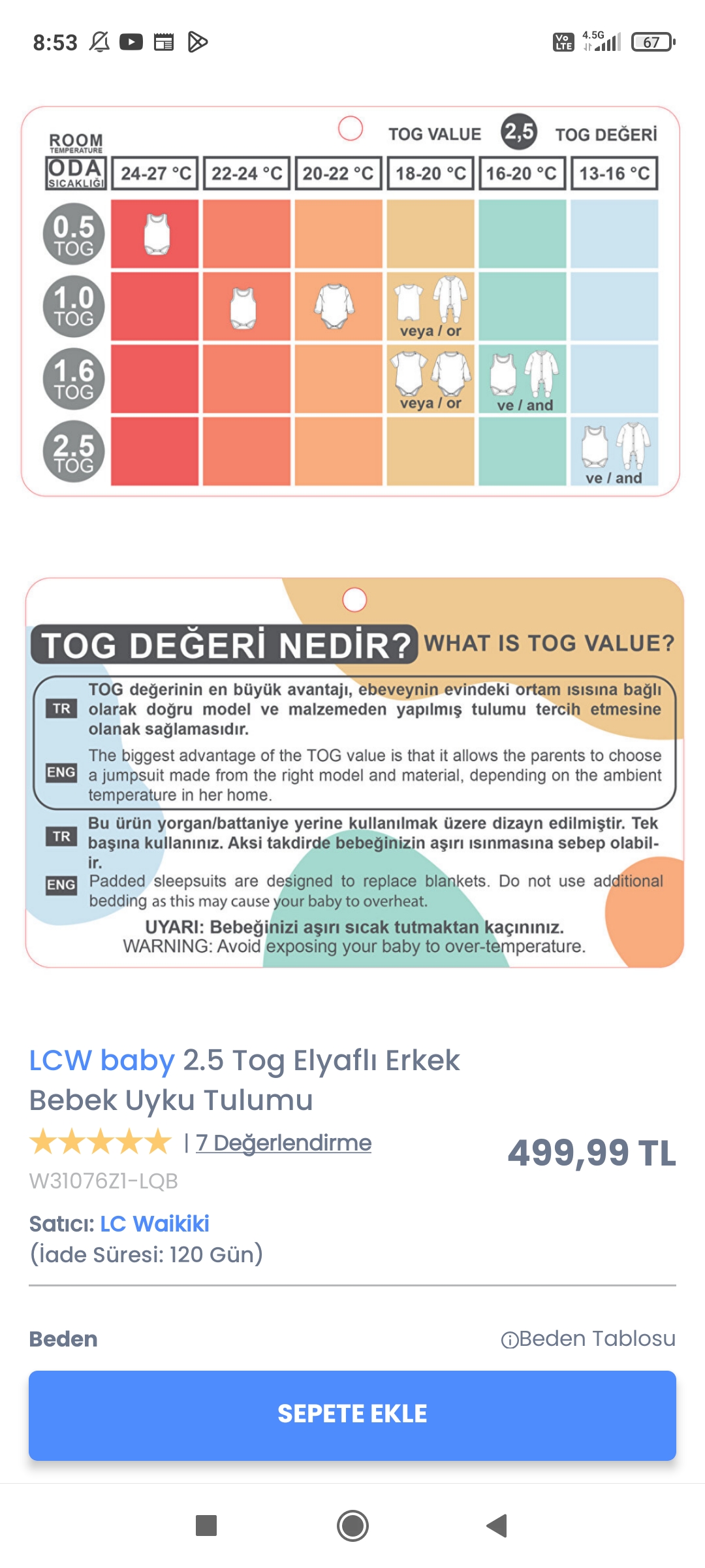 Şimdi LC Waikiki den aldığı tuluma baktım orda da tog değeri var açıklamada diyor ki tog değerinin en büyük avantajı, ebeveynin evindeki ortam ısısına bağlı olarak doğru model ve malzemeden yapılmış tulumu tercih etmesine olanak sağlamasıdır. Yani evin sıcaksa tog daha düşük değerde olmalı aksi takdirde bebeğin aşırı ısınmasına sebebi olabilir diyor canım